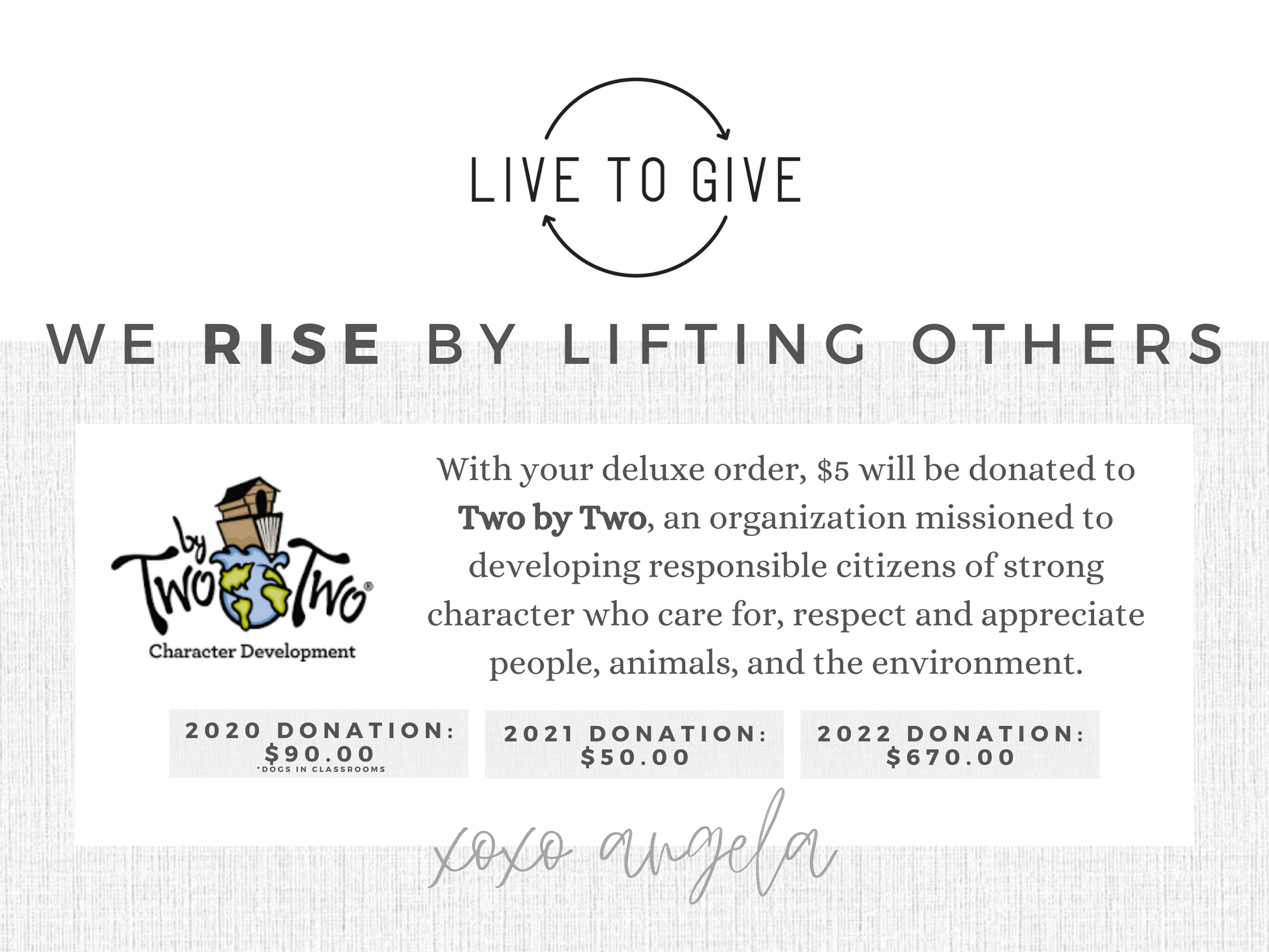 With your deluxe order, $5 will be donated to Two by Two, an organization missioned to developing responsible citizens of strong character who care for, respect and appreciate people, animals and the environment.