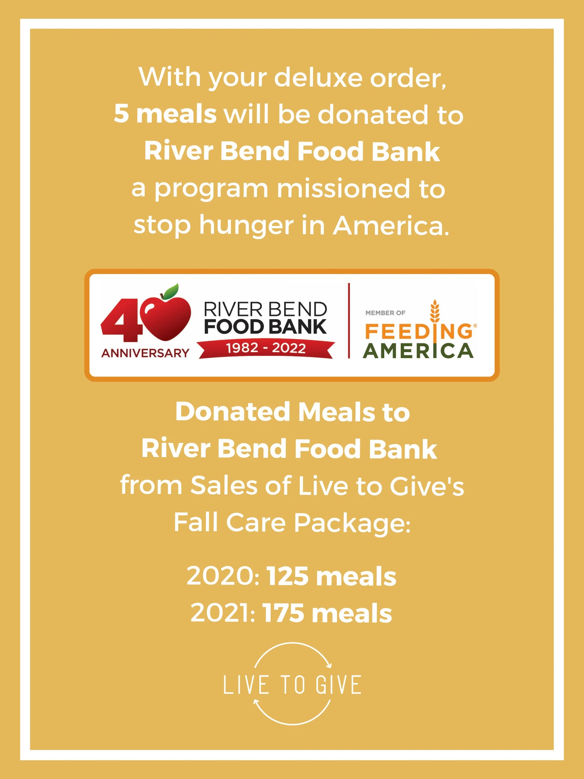 + 5 meals will be donated to River Bend Food Bank, a program missioned to stop hunger in America