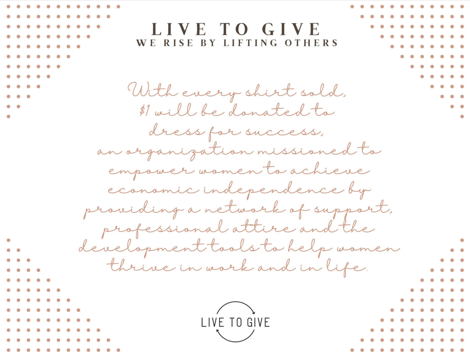 With every shirt sold, $1 will be donated to dress for success, an organization missioned to empower women to achieve economic independence by providing a network of support, professional attire and the development tools to help women thrive in work and in life.