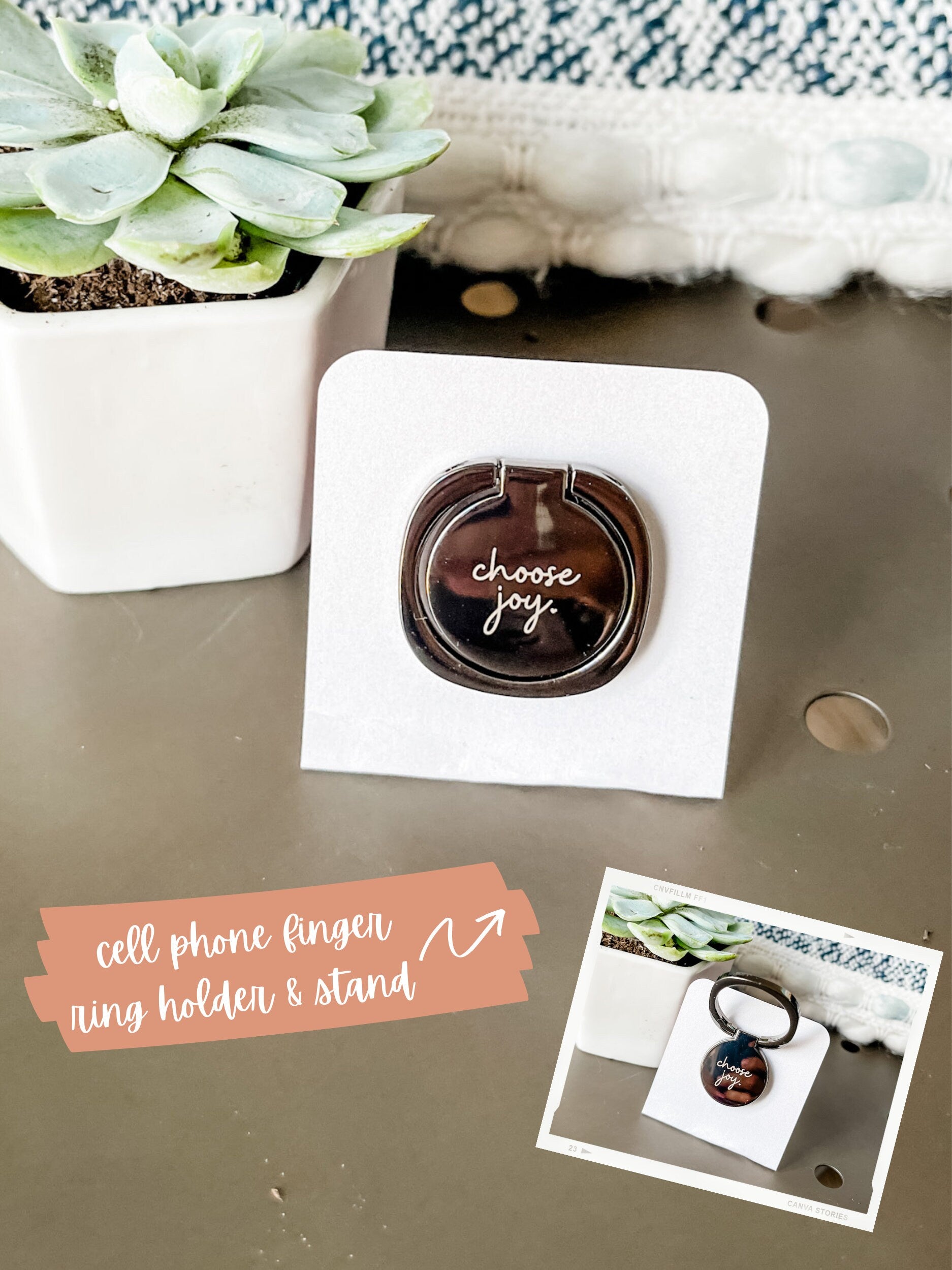 Succulent, Candle, and "Choose Joy" Cell Phone Ring Holder/Stand