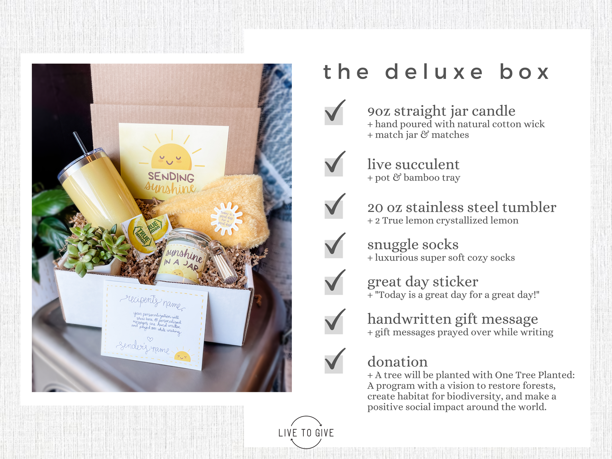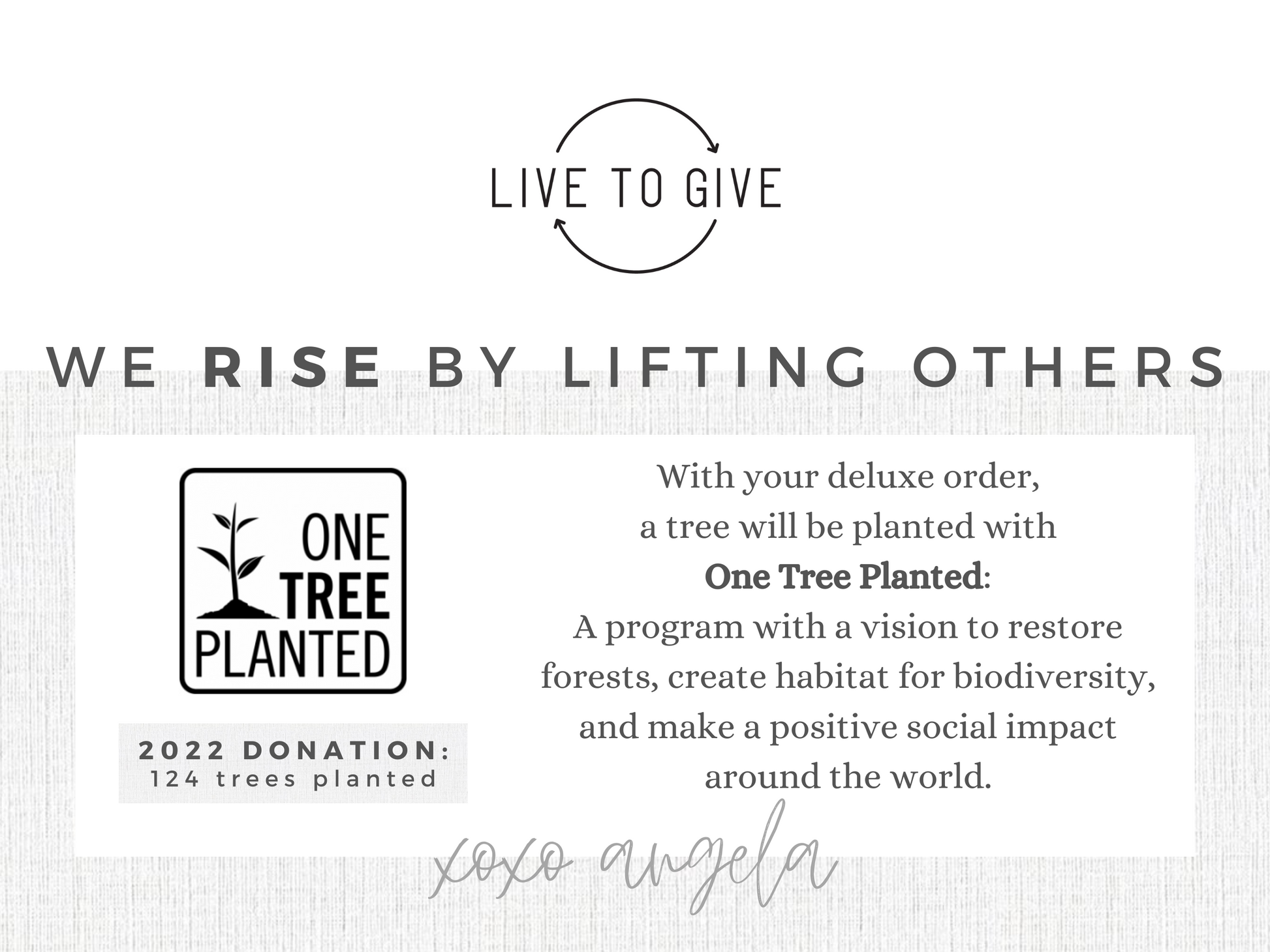 With your deluxe order, a tree will be planted with One Tree Planted: A program with a vision to restore forests, create habitat for biodiversity, and make a positive social impact around the world.