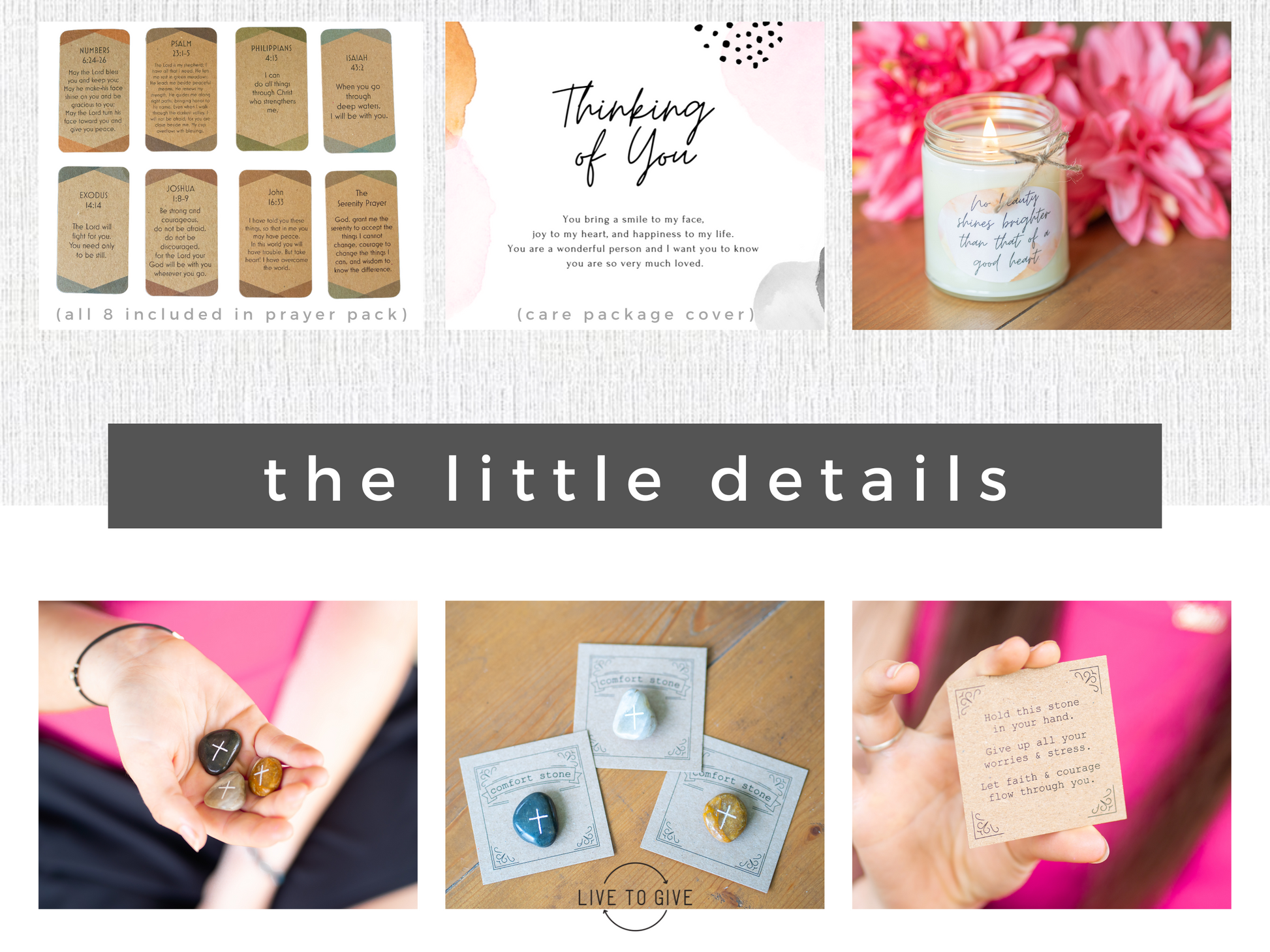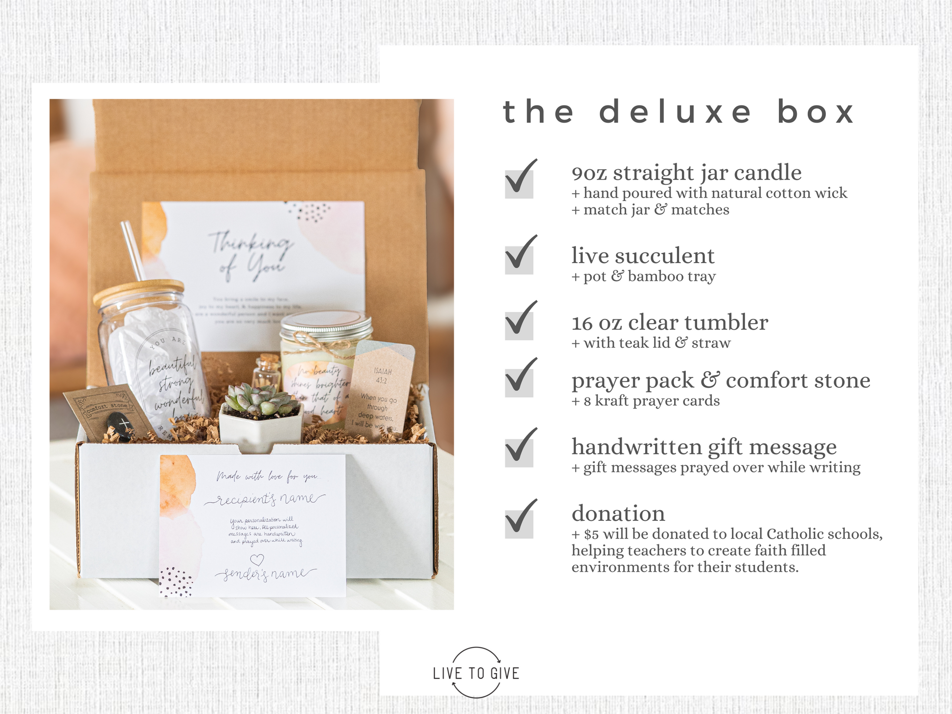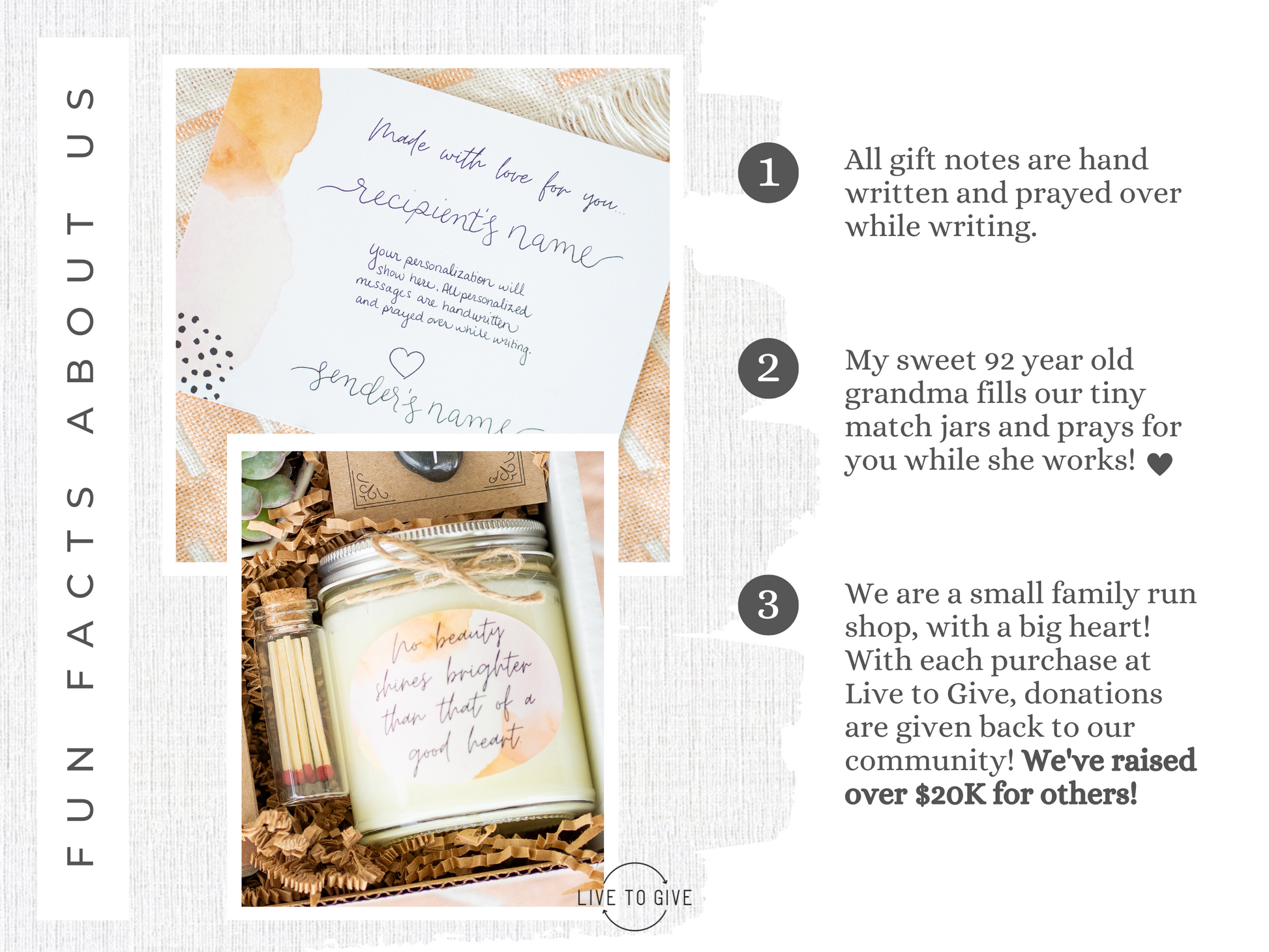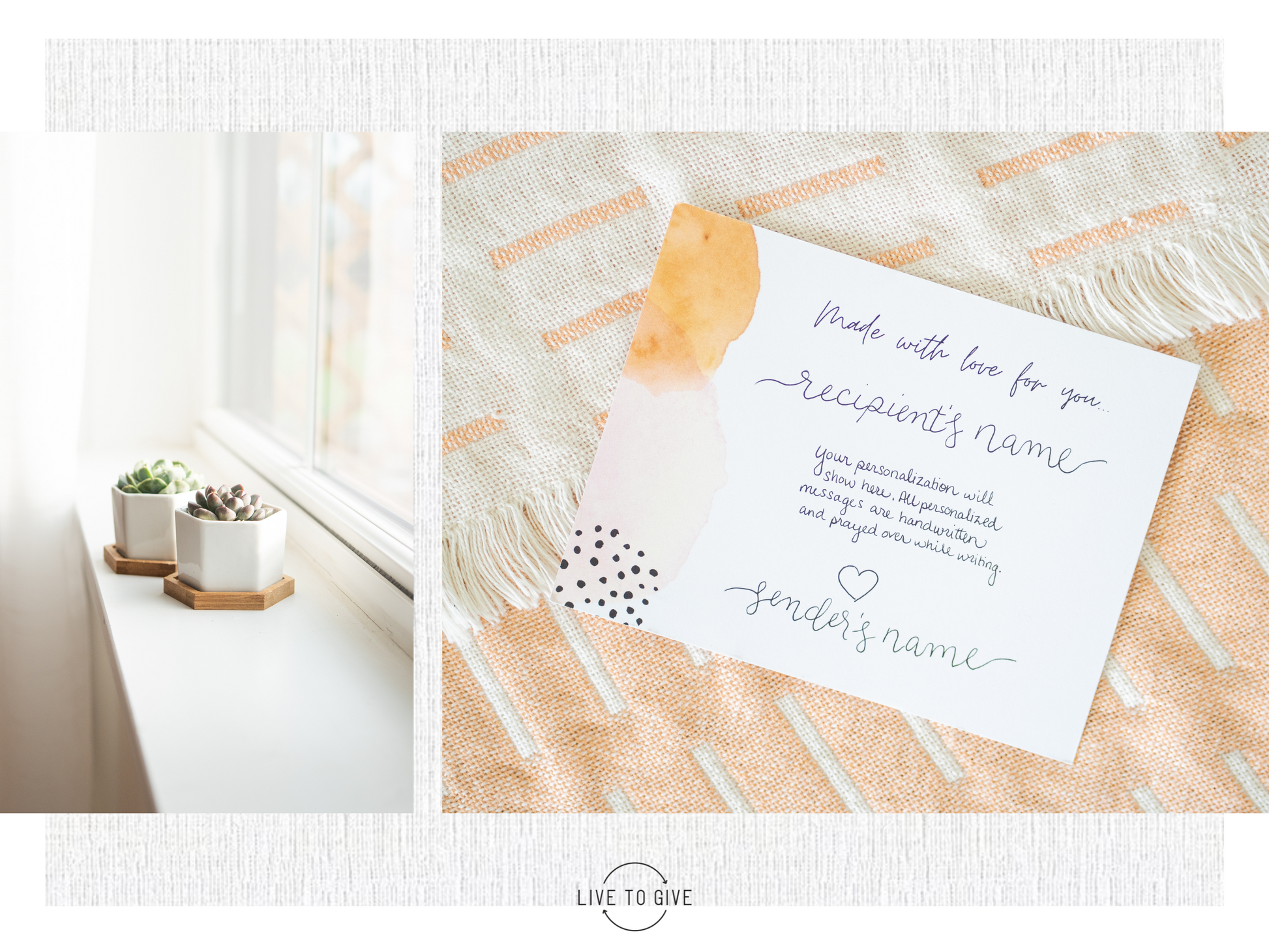 Include a personal message at no extra cost in the personalization section, all messages are handwritten on a matching notecard and prayed over while writing.